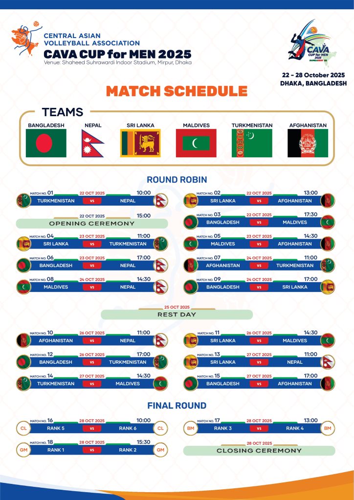 CAVA Nations Cup 2025 වොලිබෝල් තරගාවලිය 2025 ඔක්තෝබර් මස 20 දින සිට 29 දින දක්වා බංගලාදේශයේ දී පැවැත්වීමට නියමිතවඇත. ඒ සඳහා සහභාගී වන ශ්රී ලංකා ජ්යෙෂ්ඨ පිරිමි වොලිබෝල් කණ්ඩායම 2025 ඔක්තෝබර් මස 20 දින ශ්රී ලංකාවෙන් පිටත් වීමට නියමිතව ඇත.